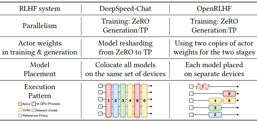 直接说有点抽象,可以看下面这个从HybridFlow里截的表格,我截了两个最早的RLHF系统,左边的DeepSpeed-Chat实现了SPMD的串行方式,而右边的OpenRLHF则是典型的MPMD系统。