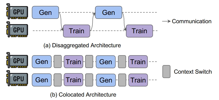 实际上,社区也确实基于Ray开发了大量的强化学习框架,目前主要的设计包括两种:Colocated架构和Disaggregated架构。粗略地说,Colocated架构意味着把生成阶段和训练阶段放在同样的节点上运行;而Disaggregated架构则把它们放在不同的节点上:
