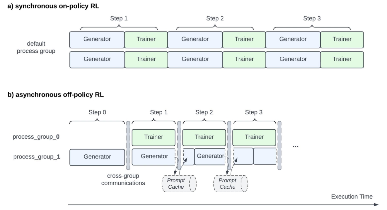OffPolicy: 允许使用稍微"陈旧"的策略生成的数据进行训练。在实际系统中,这意味着训练阶段可以使用来自之前几个迭代版本的actor模型生成的样本,而不必严格等待当前版本的生成完成。虽然引入了一定的策略陈旧性(policy staleness),但这种设计允许生成和训练阶段真正并行化,大幅提升系统吞吐量。