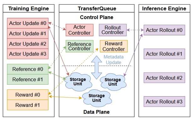 更进一步,为了更好的对训练集群和推理集群进行协调,我们可以引入通过某种数据缓冲区或队列连接来作为两个集群的交互点。这种设计可以实现生成和训练的近乎完美重叠,从而消除流水线中的大部分空闲时间。这里的一个例子是AsyncFlow,这个框架基于TransferQueue来传输数据,并控制训练的执行。