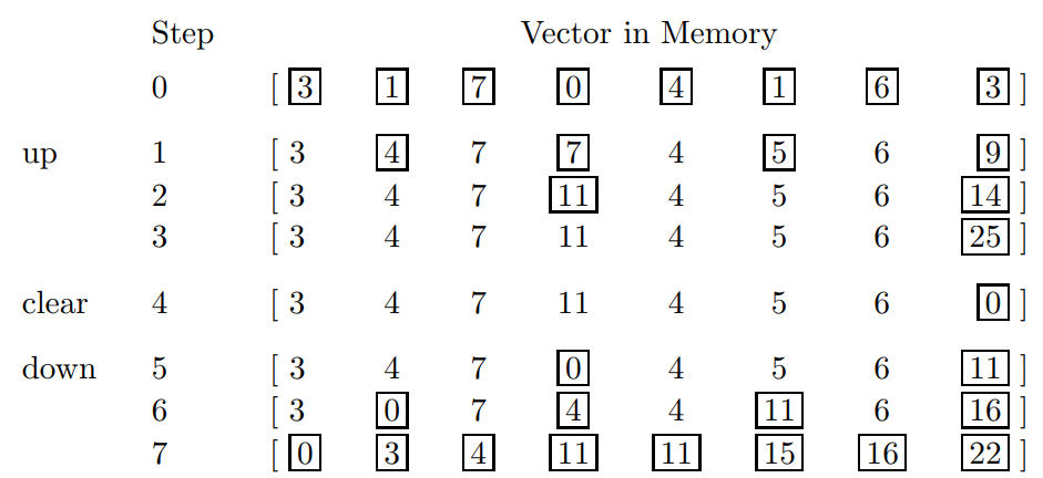 最终数组会变成 Exclusive Scan 序列(即每个位置存储它之前所有元素的和)。
