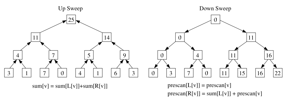Down Sweep 的核心思想是:利用 Up Sweep 阶段在树节点中留下的中间结果,从根节点开始向下分发“左侧累加值”信息。